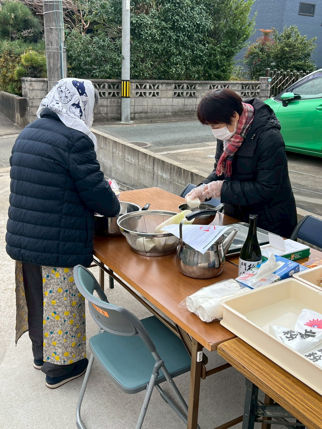 前日から少し心配していたのですが、1月4日の朝、カーテンを開けると眩しいほどの冬晴れが広がっていました。気温は8℃前後と冷え込んでいましたが、風は穏やか。澄んだ青空のもと、町内会広場の吉村会長邸駐車場には、朝から準備に集まった方々の姿がありました。