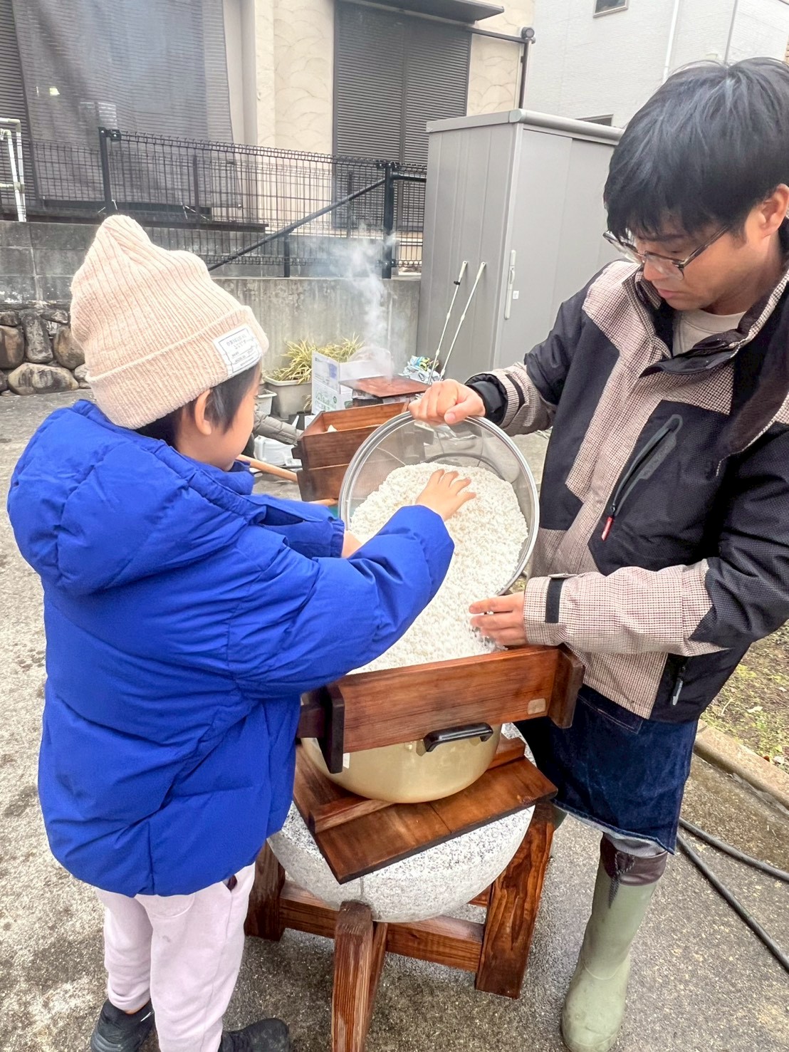 「去年初めてやってみたら大好評で、今年もやろう!」という声から生まれた第2回 新春餅つき大会。前回の多すぎた10Kg反省を活かし、もち米7kg用意しました。前日から水に浸けておいたもち米を見ながら、気持ちは高まります。
